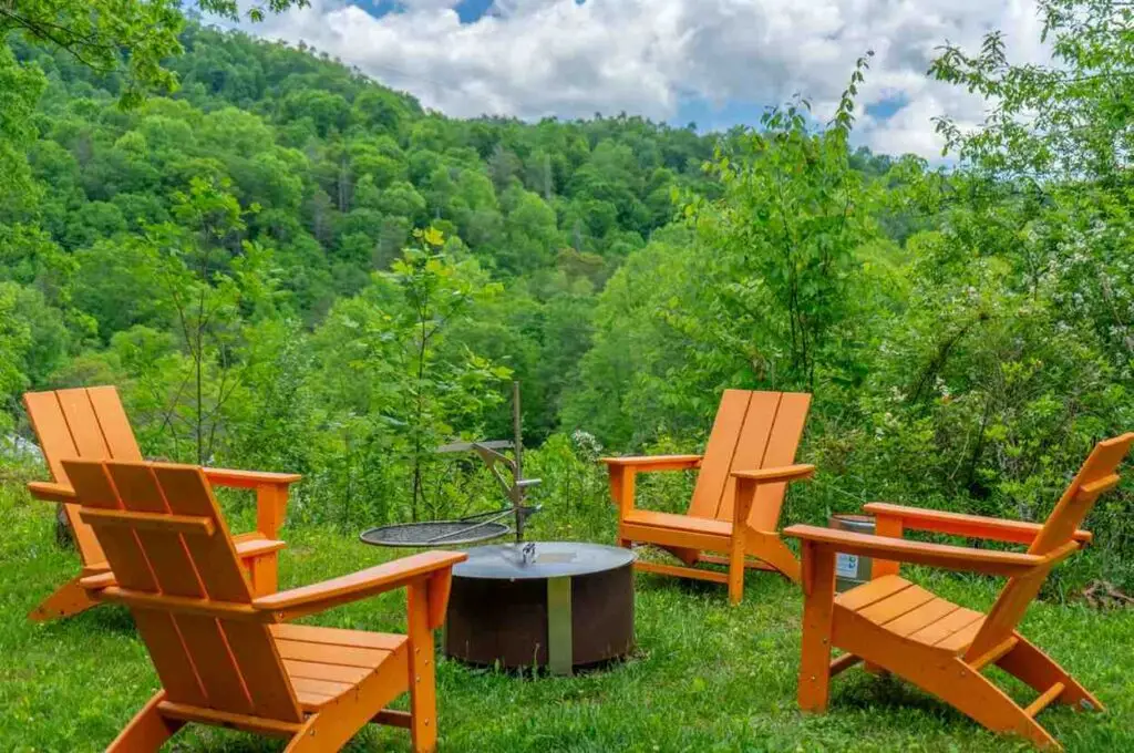 Adjacent to the porch and overlooking the Campground there is a Breeo fire pit with grill attachment and 4 Adirondack chairs.