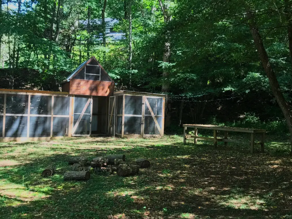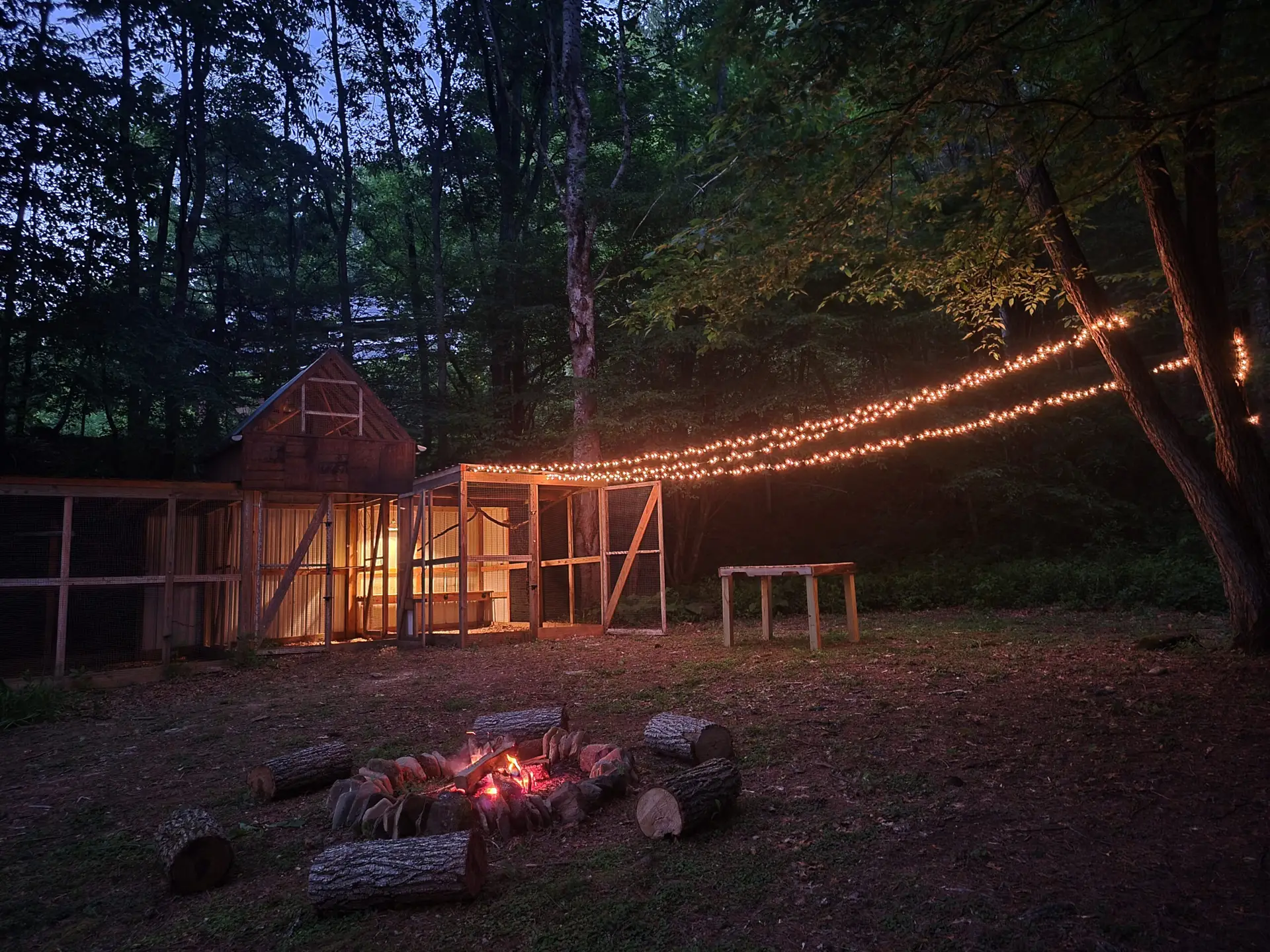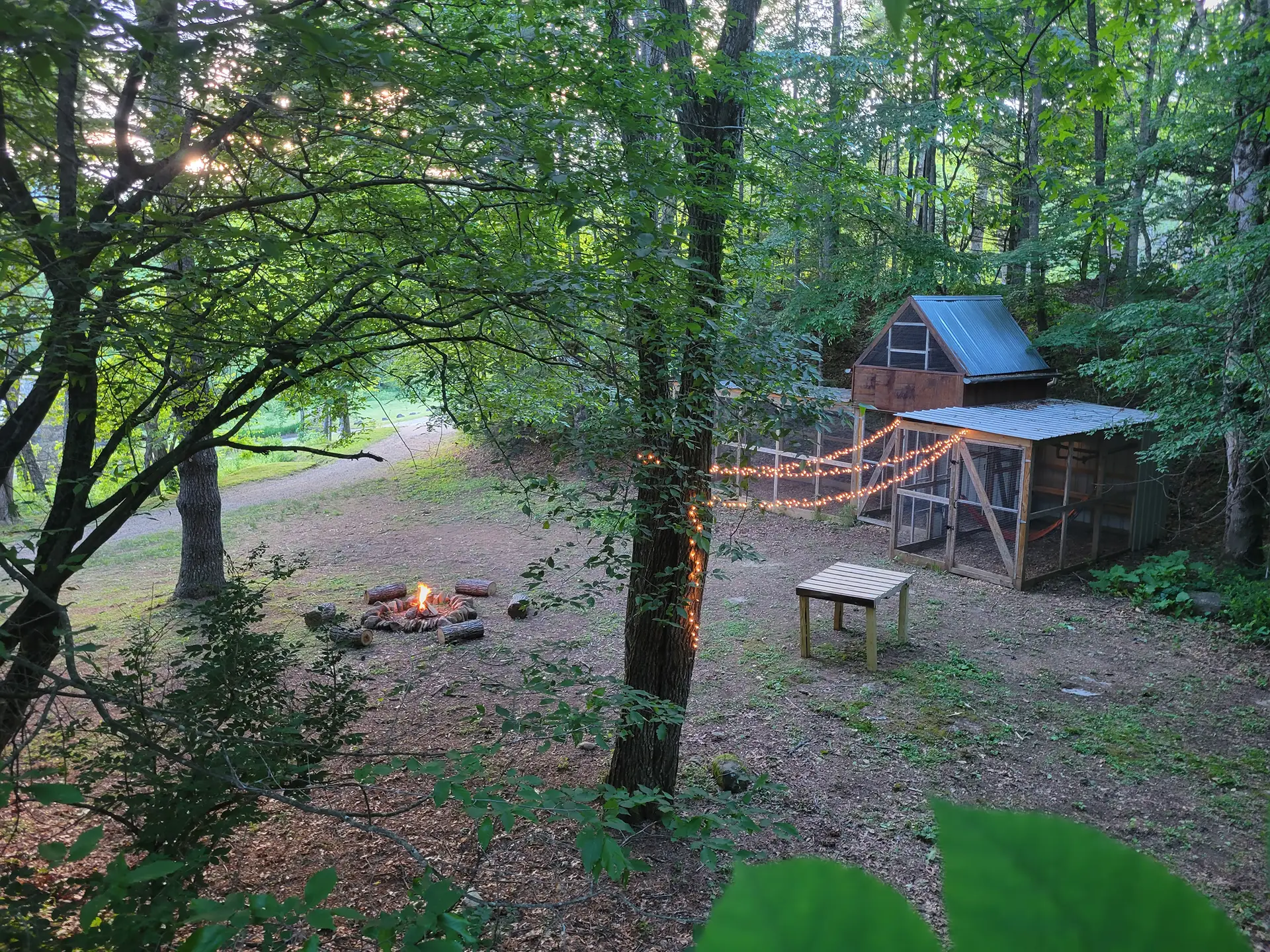 The roofed area is a former poultry habitat, with screened walls and a solid floor to keep you off the ground. Hooks in the walls are perfect for hanging hammocks and lanterns.